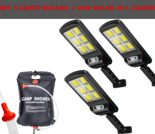 Set De 3 Lampi Solare, Cu Senzor De Miscare SI Telecomanda, 300W + CADOU Dus Solar 20 Litri
