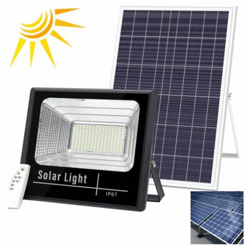 1+1 GRATIS: Proiector LED Cu Panou Solar VELORA , 50W, Control Prin Telecomanda, Senzor Crepuscular + Accesorii+Lampa Solara 100x Led CADOU