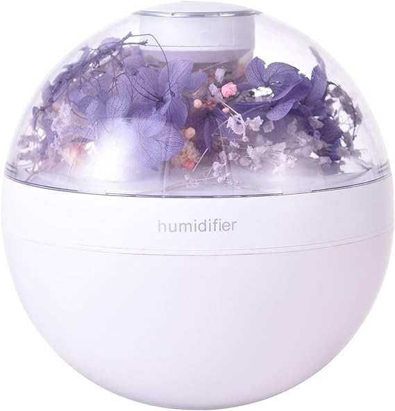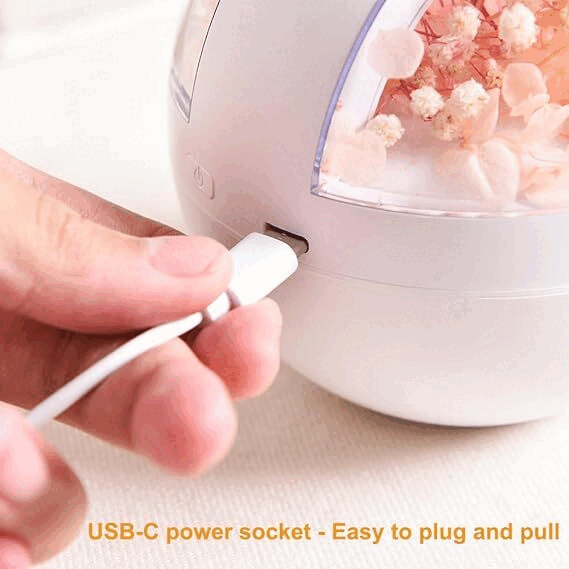 Florile artificiale adaugă un element de frumusețe și naturalețe, transformând difuzorul într-o piesă decorativă remarcabilă. Iluminarea alb caldă completează atmosfera, oferind o lumină blândă și relaxantă, perfectă pentru serile de relaxare.