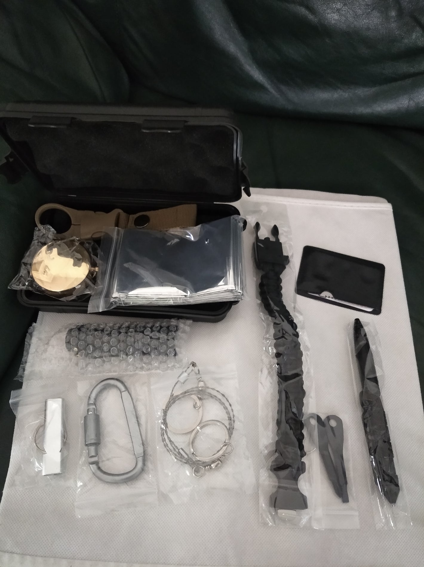 ✔️ Pachetul include: busola, fierastrau, cutit, clema pentru sticla de apa, patura de urgenta, piatra de silex, cutit de supravietuire, lanterna, pix tactic, fluier, mini lanterna, cutie impermeabila neagra
