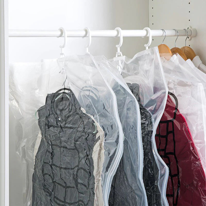 Cu acest set de saci de vidat, primești nu doar organizare și protecție pentru hainele tale, dar și un plus de spațiu în dulap sau în zona de depozitare. Facilitează-ți viața cu acești saci de vidat cu umerăș și agățătoare pentru haine, pentru o organizare impecabilă!